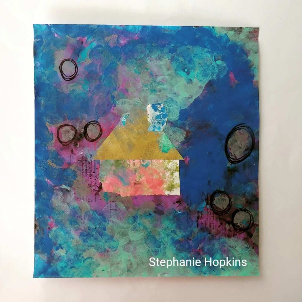 This painting spoke to me as I created the depth of the background and the collage house. There is a story within those walls. I find myself drawn to explore houses further in my work. Houses have always been a deep fascination of mine. Especially old dwellings. -Stephanie Hopkins