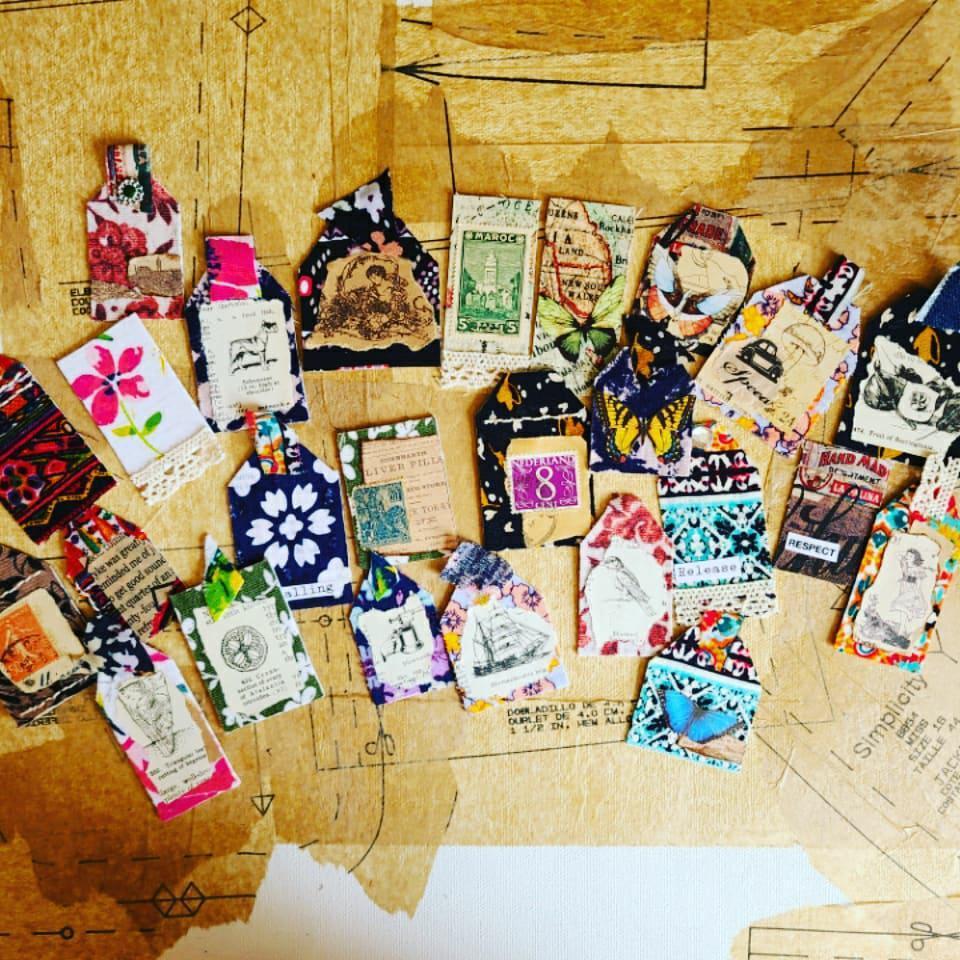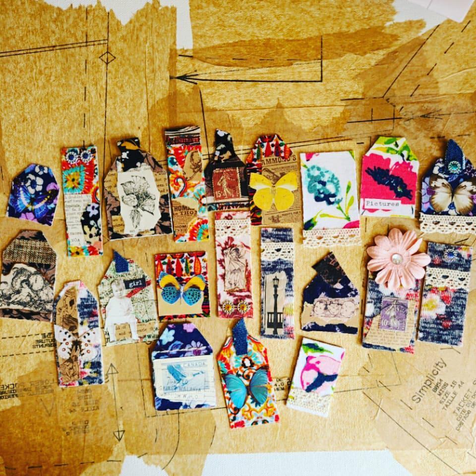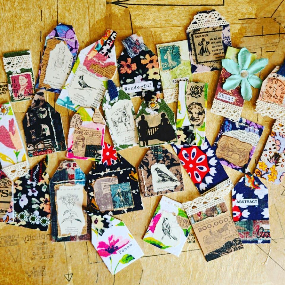 Lately, I have been using my fabric squares and scraps for making journals, notebooks, journal and art tags, artist trading cards, bookmarks, altered playing cards, greeting card making, and collage work. These projects are great for any age, even two-year old’s!