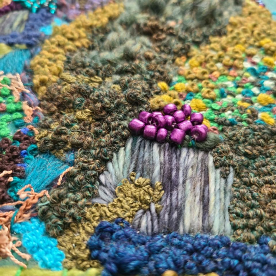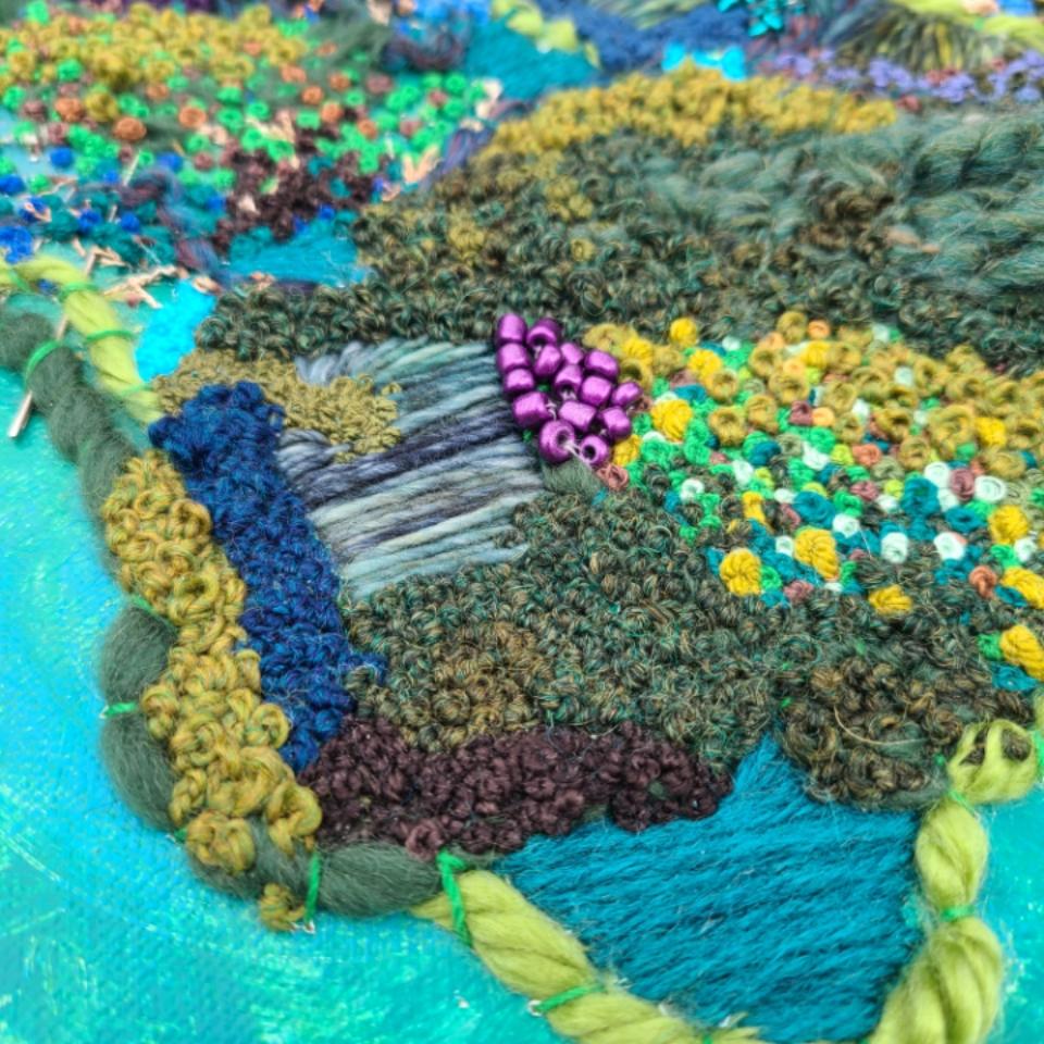 Today, I am sharing a piece I started back in 2023 and the terrain I’m building on canvas has been a journey with all sorts of twisty paths taken. I first began this piece by applying moss in the center and began stitching only French knots in the blank spaces. While I loved the start of filling the spaces with stitchery, I wasn’t feeling the moss and I put the canvas aside to rest and reflect on where I want to go with the terrain. Then the rest became a long slumber and this year it came to me the path I wanted to take with this piece. It is not always this way when I create a new art piece. More times than not, my creative ideas really flow. I don’t stress about it because then the journey is for naught.