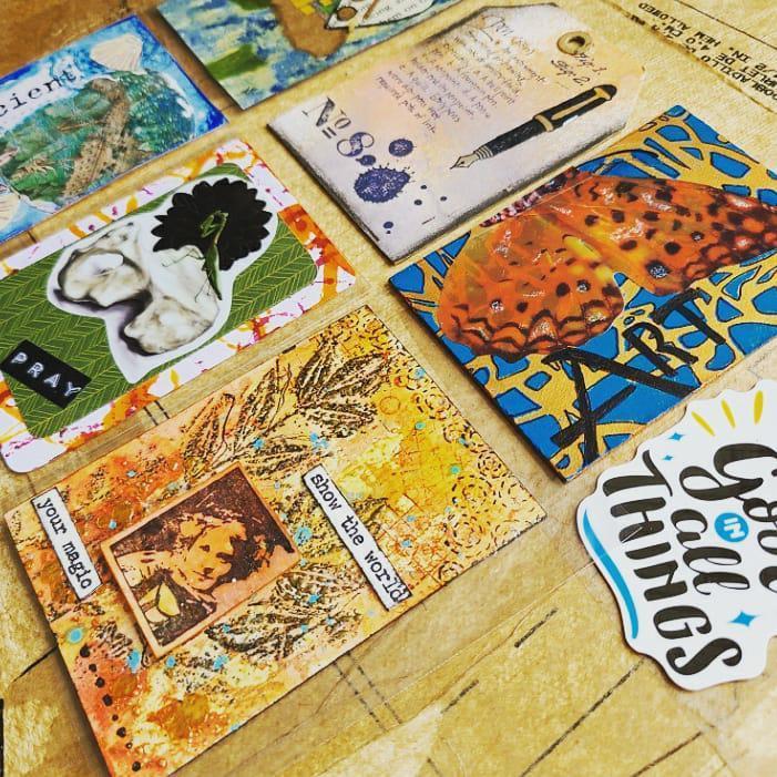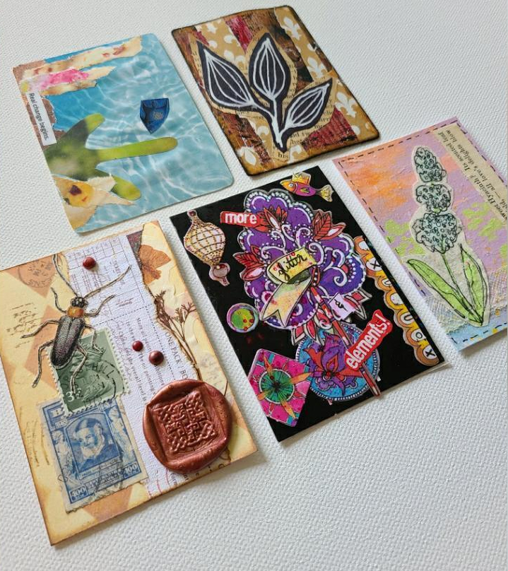 These two swap groups are open with how you choose to create your cards. I usually create collage as my background and work from there. I have created a few of my floral and landscape paintings for the swaps. These cards are for trading only, and conducted via mail from online groups.