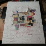With the collage part, I started inward and worked outward, using a lot of layers and I wanted to give the illusion of an old building that’s facing was slowing peeling away with time. To put the final touch on this piece, I will be framing the canvas and most likely paint the wood a teal color to lighten it up a bit. We will see. Please excuse the badly taken photos. I used my phone and it is old. The images are much sharper and clearer in person of course.