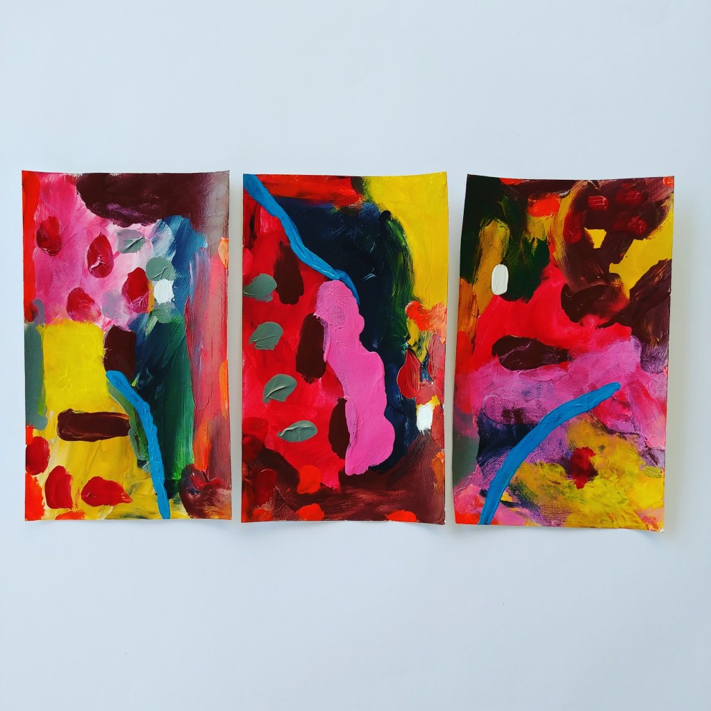 The images with three cards (Day 92) was a special series I painted inspired on a morning stroll from the previous day. I had taken lots of photos of landscapes, beautiful shrubbery and wanted to use colors I saw depicting our walk. The colors are so vibrant! Really pleased how they turned out and they have given me inspiration for other art pieces. They would look fantastic in frames!